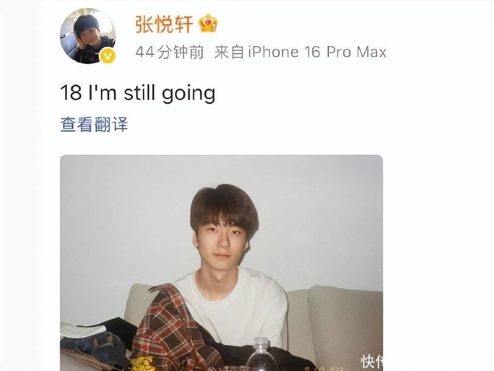 4. 他在个人社交平台发布近照,一头时尚发色衬托出青春气息,笑容依旧如阳光般温暖,配文写道:“18 I'm still going”,简洁却充满力量。