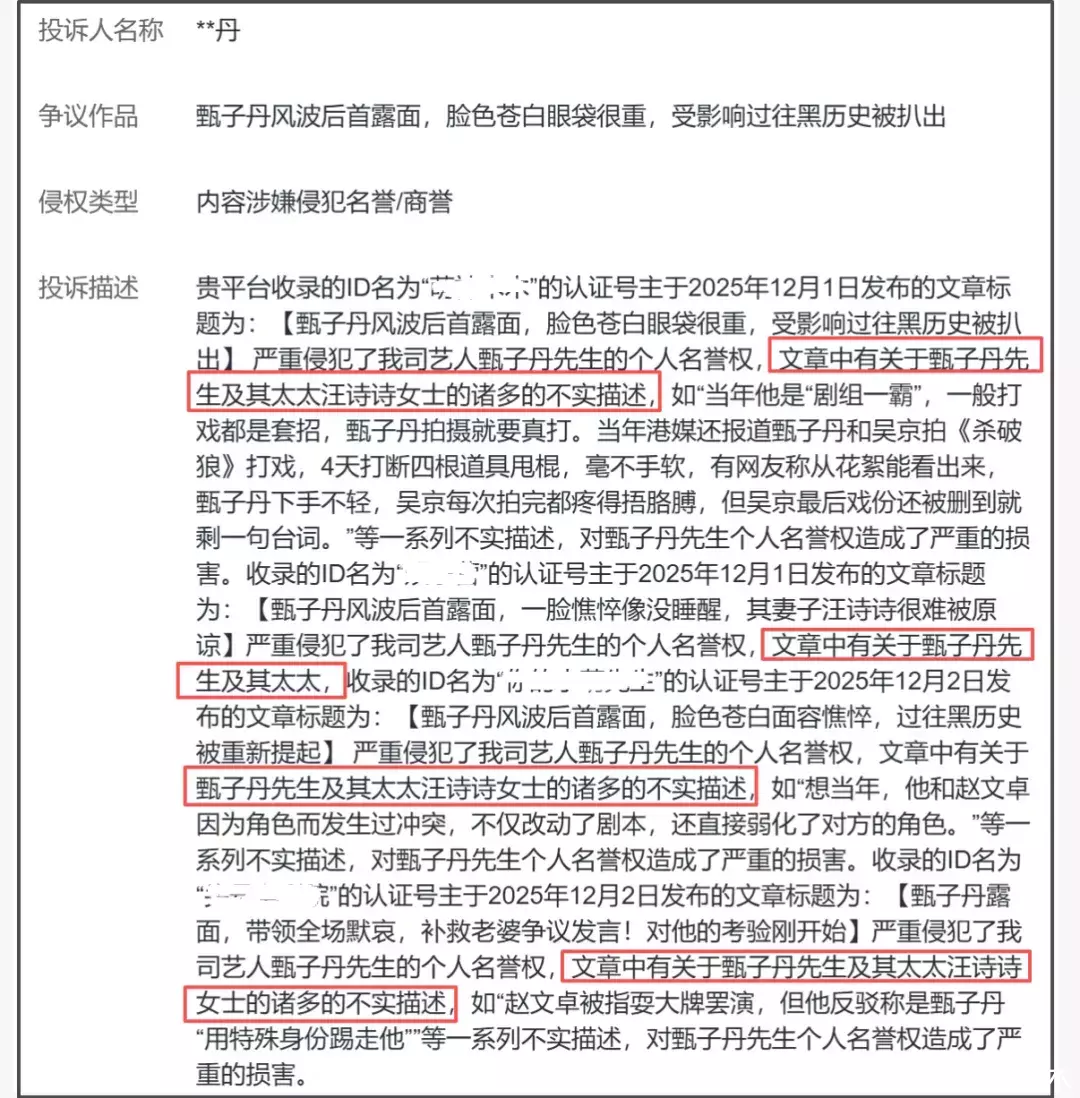 香港火灾期间,甄子丹老婆陷入言论风波,甄子丹也深受其影响,不仅社媒评论区沦陷,还被考古拍戏往事。虽然甄子丹并未公开回应,但其实已经开始偷偷投诉相关内容,理由是有关甄子丹及其太太汪诗诗的报道不实,严重侵犯甄子丹名誉权。