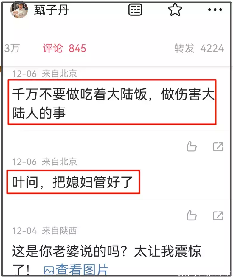 甄子丹的评论区最新评论区也没什么好话。网友直言,千万不要吃着大陆饭,又做伤害大陆人的事情,还有网友喊话甄子丹,“叶问,把媳妇管好了”。