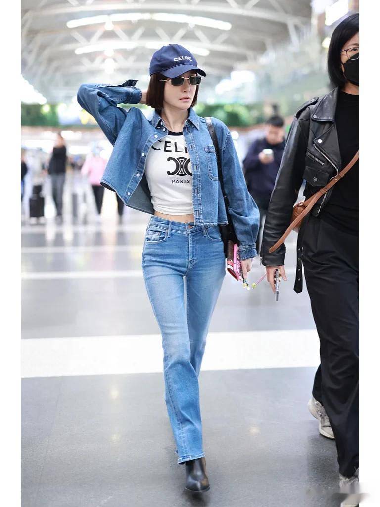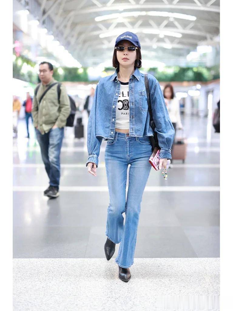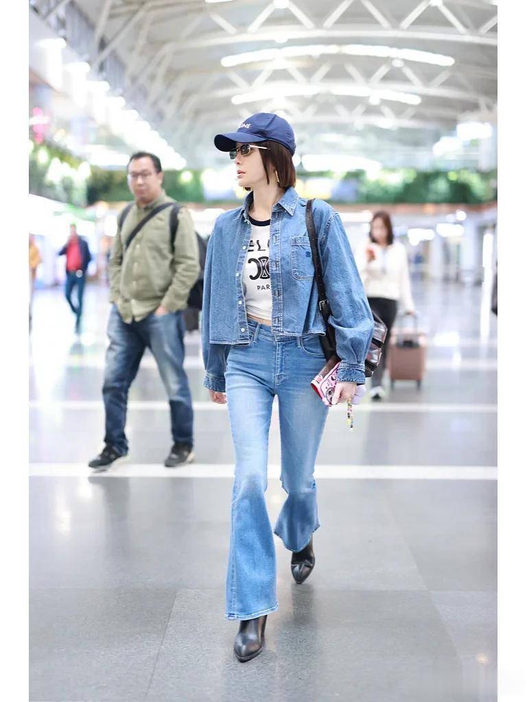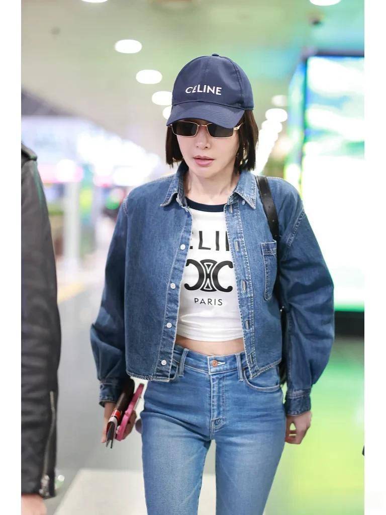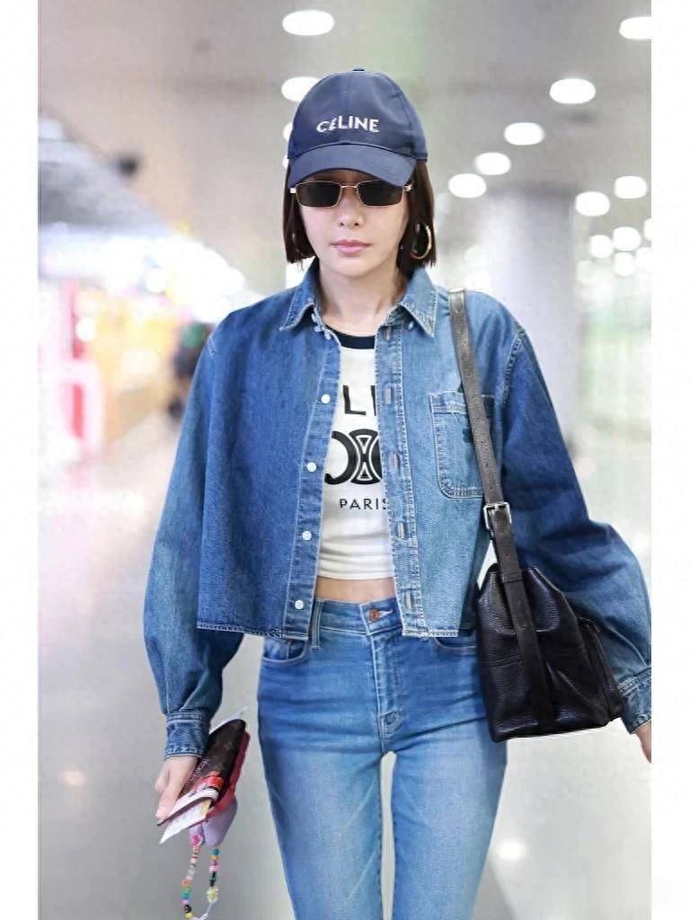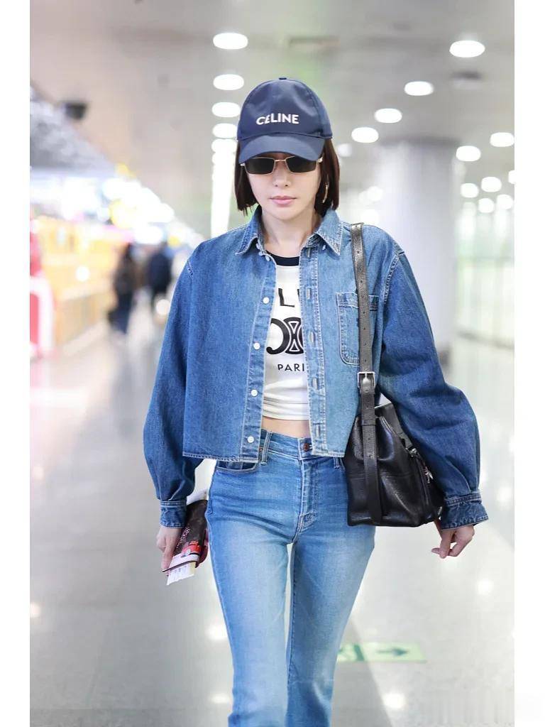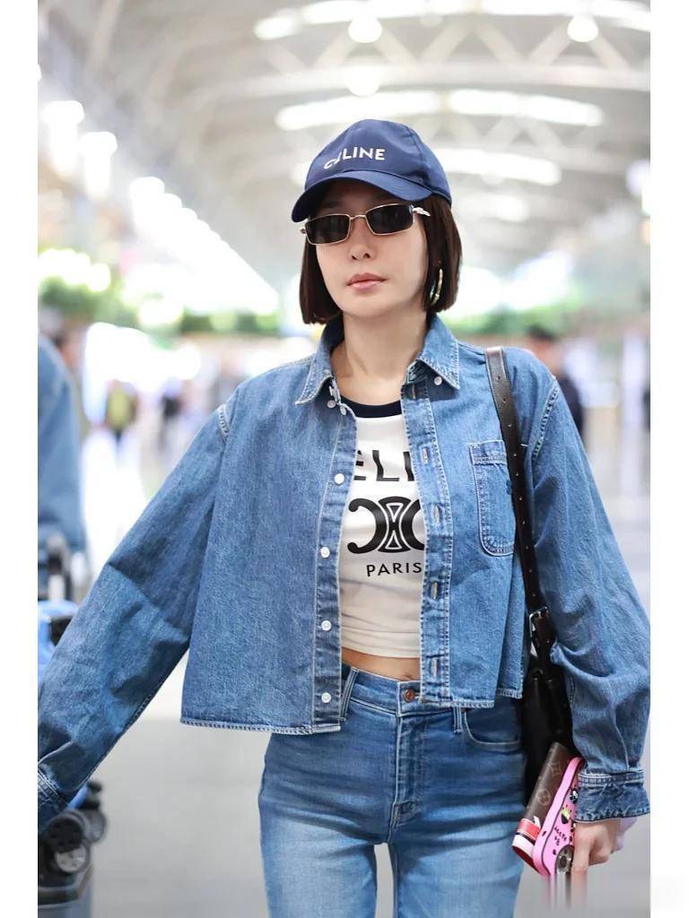 秦岚头上戴着一顶深蓝色的棒球帽,帽檐压得恰到好处,搭配一副黑色的方形墨镜,直接拉满了休闲又酷飒的氛围感,简单的配饰就把机场穿搭的随性腔调拿捏得死死的。上半身外层穿的这件蓝色牛仔外套,是当下超火的短款剪裁,衣长刚好卡在腰腹最细的位置,一眼就能看出显高的小心思。牛仔面料带着自然的做旧纹理,摸起来应该是柔软又有筋骨的质感,不会硬邦邦地硌人。